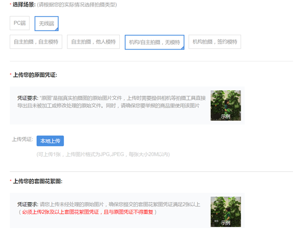 第三步:上传举报图的原图凭证、套图花絮图,并上传店主手持身份证或者护照拍摄的图