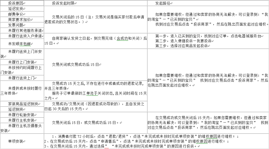 买家付款后,商家未履行特定承诺的,买家可在以下时限内投诉商家: