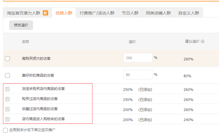 第四步:在这个时候我们需要开始测试人群,因为人群会是之后带来产出的主要来源,所以必须要测试精准,每个款的人群都不一样,可以借鉴,但不能全部套用。这里就是建议所有的人群都最好单个打开,不要在测试阶段就尝试组合人群。这里是建议优质人群里后面四个人群,以及自定义人群里面的所有单个人群,都建出来,进行测试。测试人群是一个需要长时间段的事情,我们看数据一定要根据近7 天或者14天的数据,在一个时间段的情况下,看点击率,不太好的先暂停然后进行记录,以免后续重复使用。
